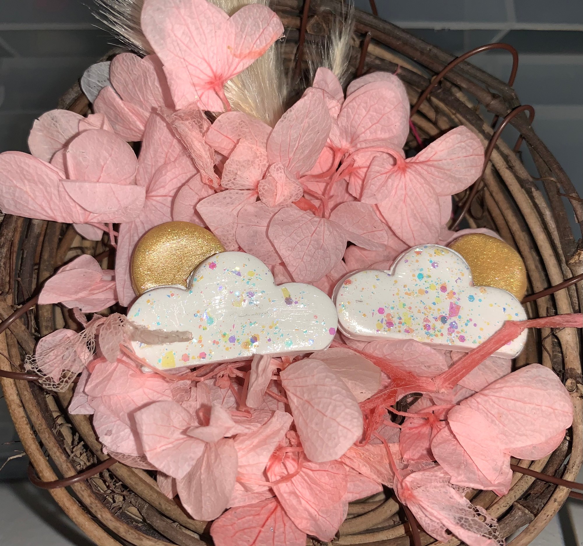 These lightweight clay cloud earrings come glossed with iridescent glitter chunks. They also feature a peek-a-boo sun. These can be made with traditional posts or clip ons.